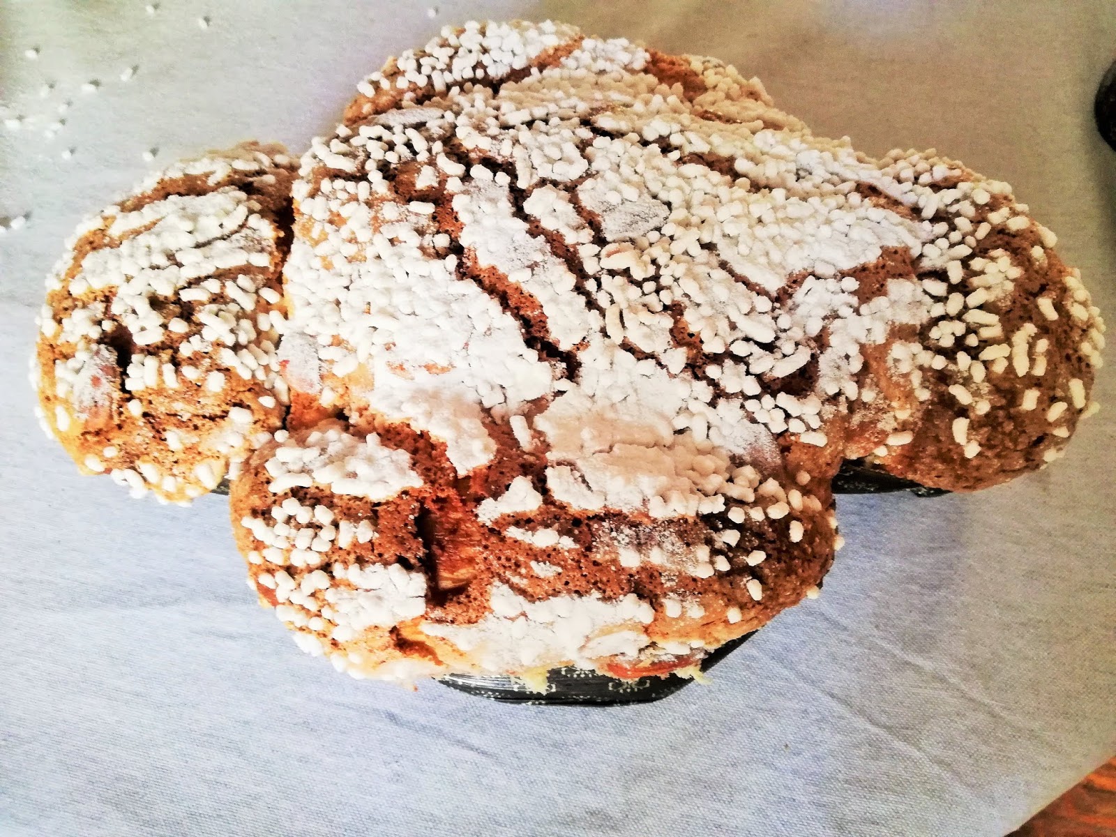 Ingredienti: g 375 di farina W 320, g 125 farina 0 o 00, 130 g di zucchero, 135 g di burro morbido ,125 ml latte, 120 ml acqua, 6 tuorli, 300/ 350 g canditi, circa 40 g mandorle con buccia, per la lievitazione mista 1 g di lievito di birra e 80 g di licoli rinfrescato 2 o 3 volte ben incordato oppure 100 g di licoli rinfrescato 2 o 3 volte e incordato o 5 g di lievito di birra fresco o 2,5 g di lievito di birra liofilizzato, 4 g sale ,5 g di malto o miele, i noce di burro e la buccia di un'arancia grattata, albume q. b., zucchero in granella q.b , zucchero a velo q.b,1 cucchiaino raso di malto diastatico (facoltativo).